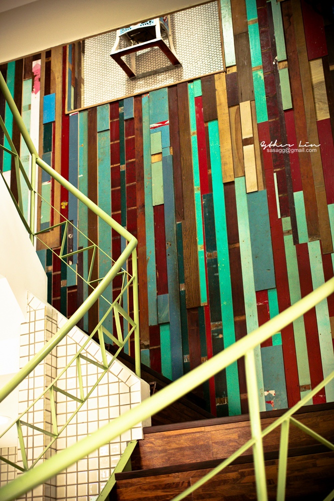 店內有許多牆面都是利用各種顏色的舊木板拼湊而成的,營造低調卻又引人注目的感覺。